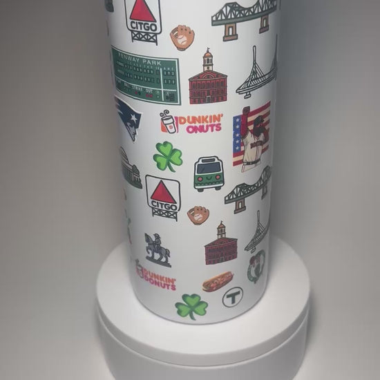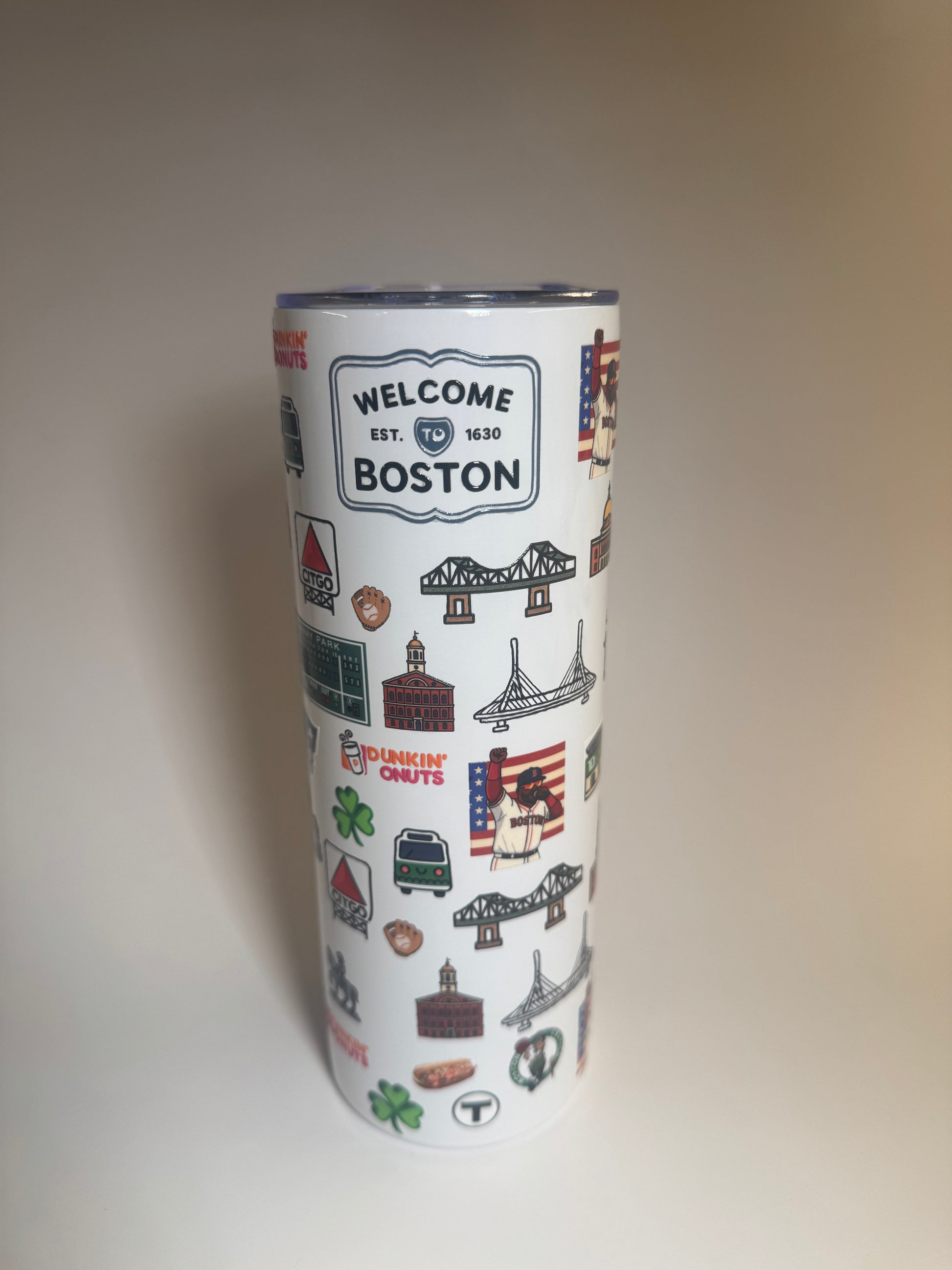 This 20 oz insulated tumbler features a wrap-around design showcasing iconic Boston landmarks, celebrating the city’s history, architecture, and culture in one bold and stylish cup.